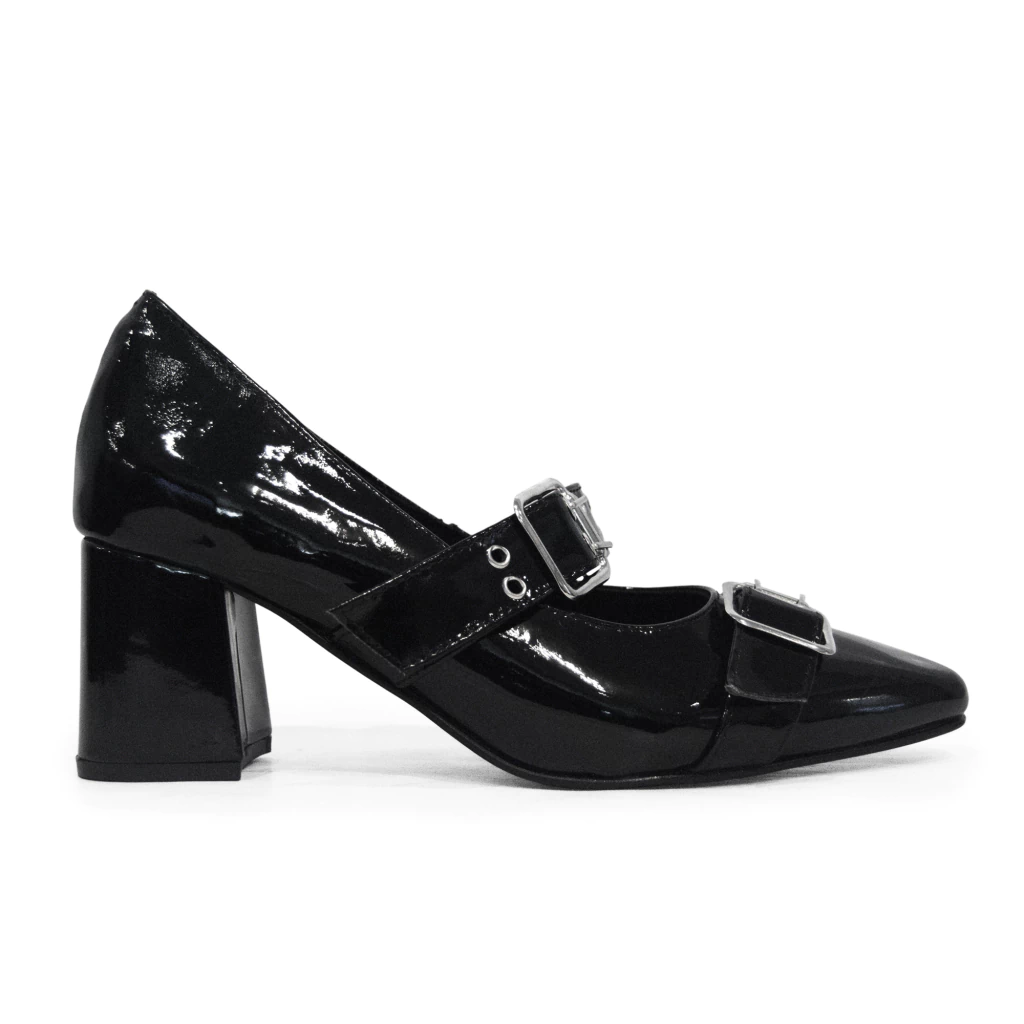 Zapato en punta con doble tira con tachas y hebilla y taco de 5,5 cm