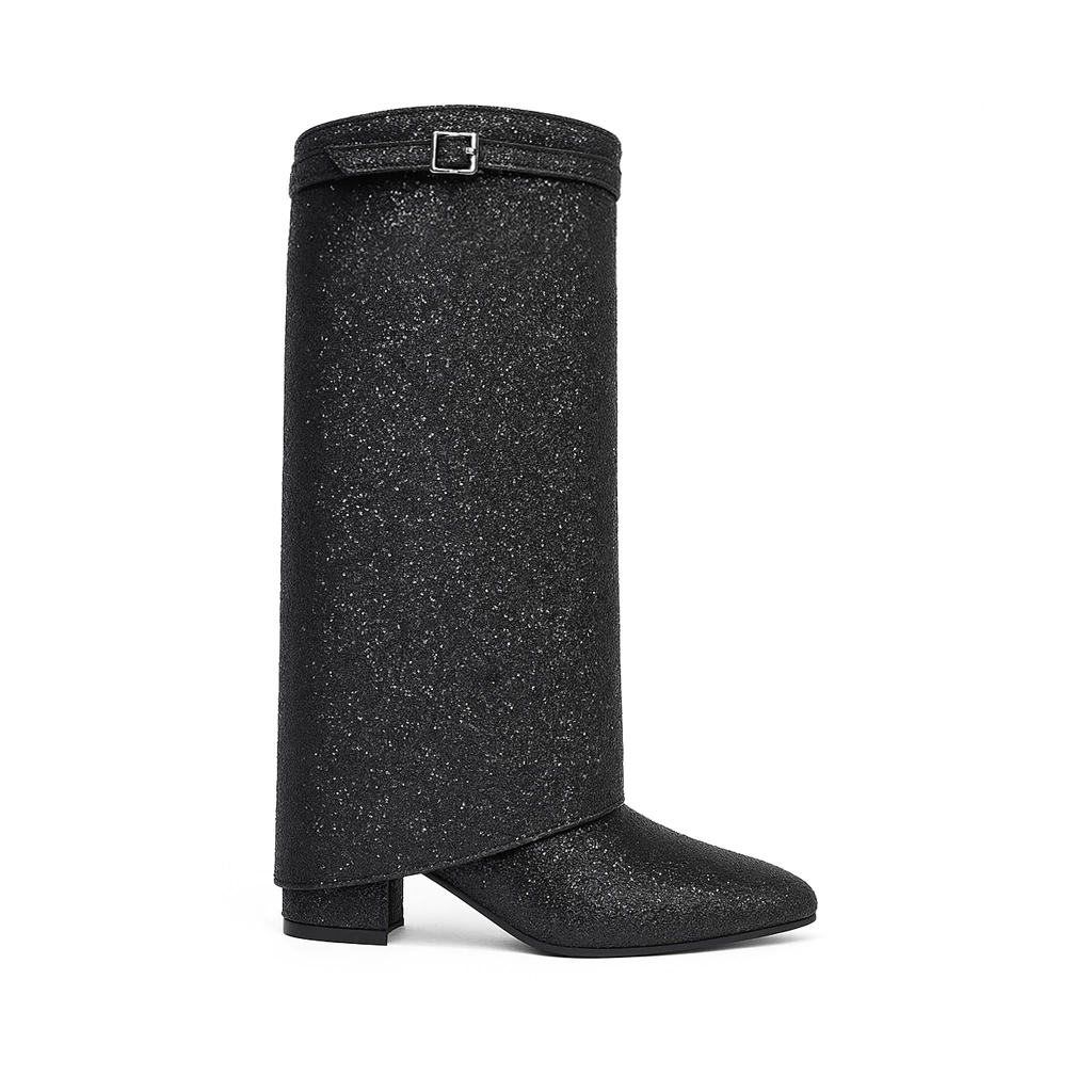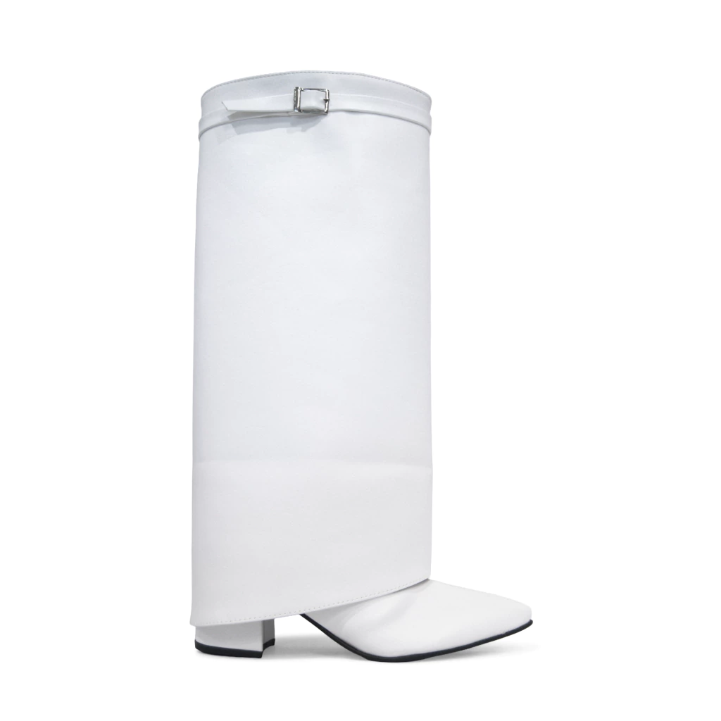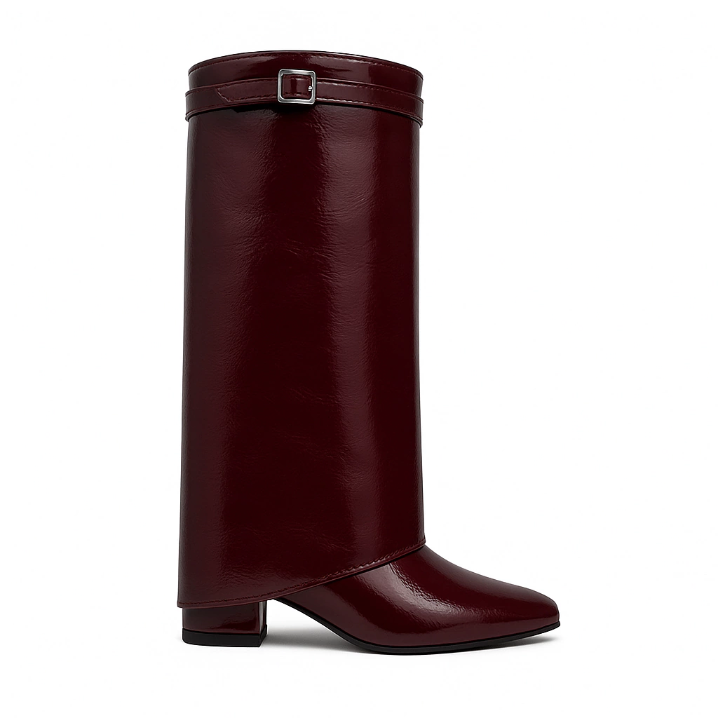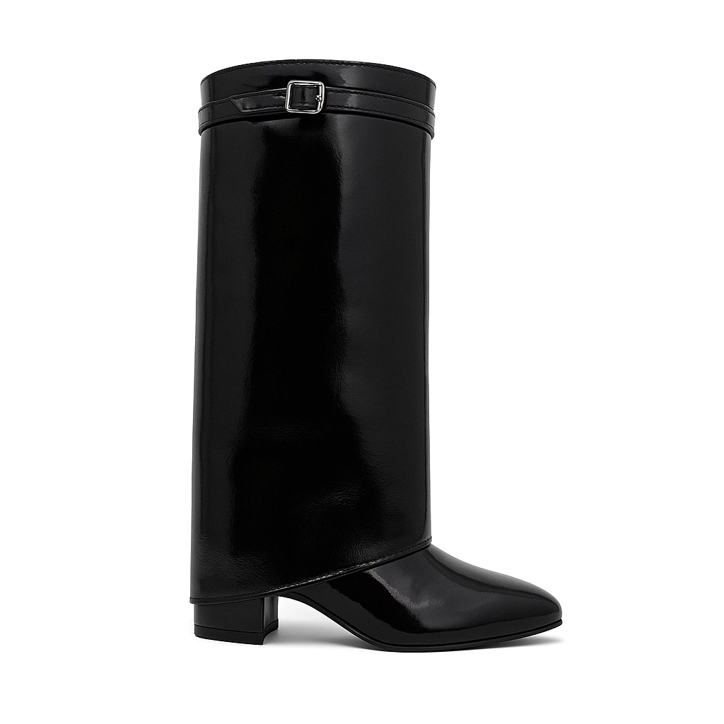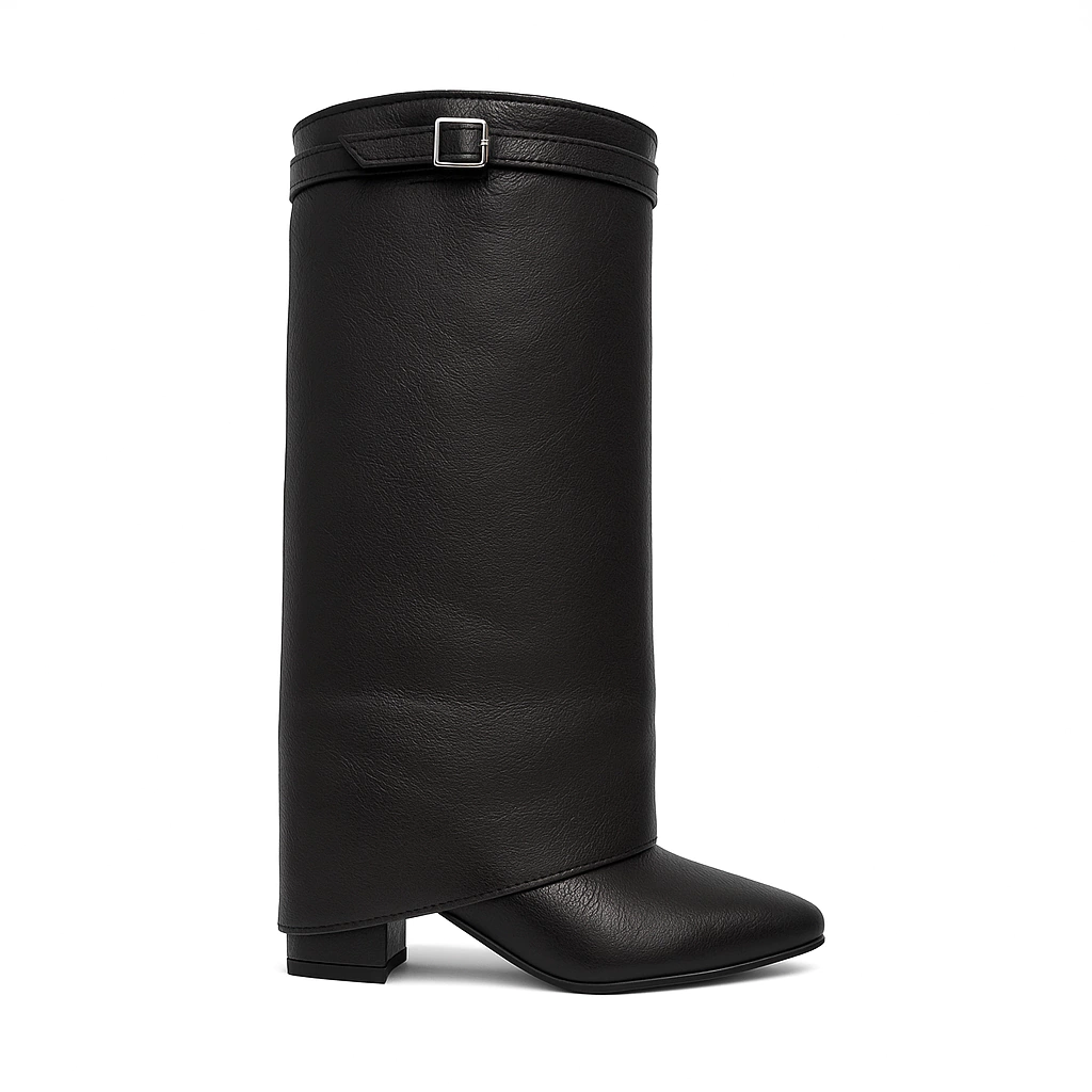 Bota en punta, caña alta con capa, tira con hebilla y taco de 5,5 cm