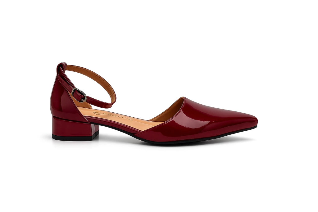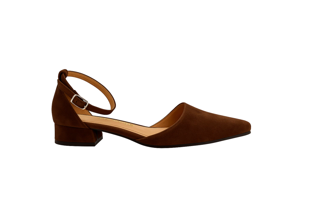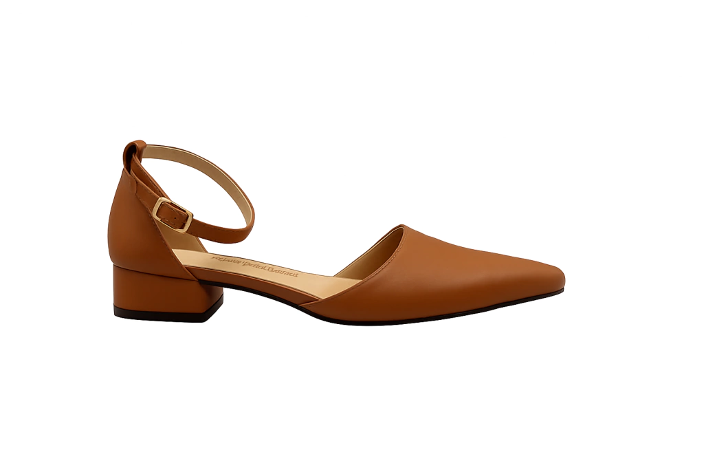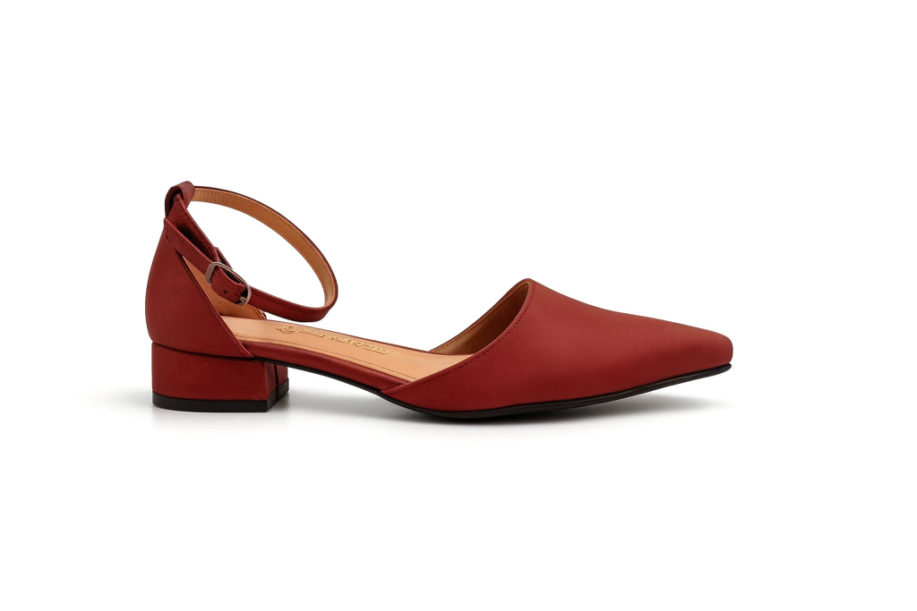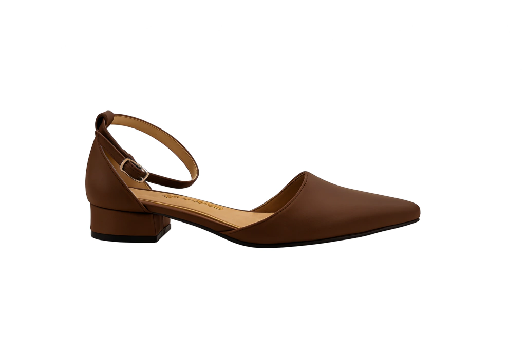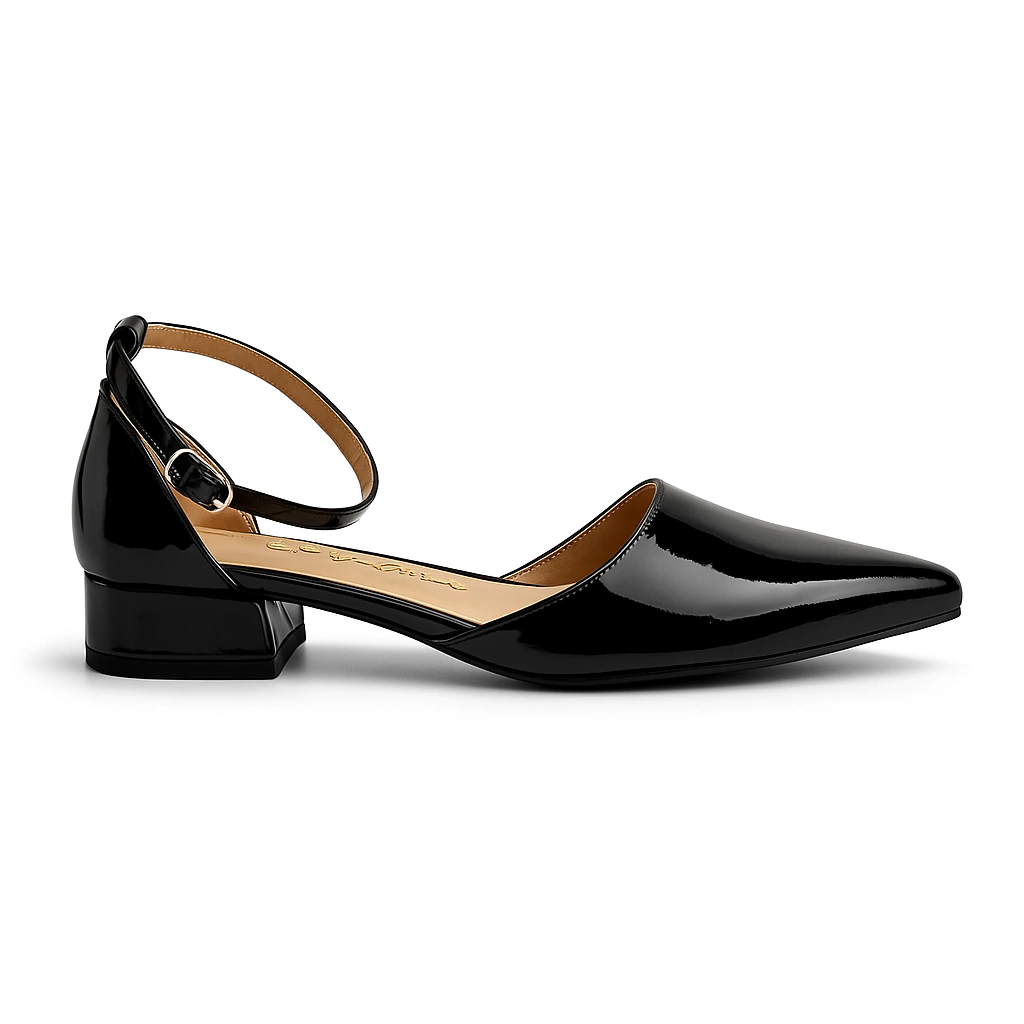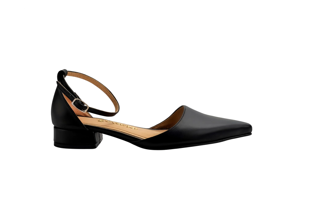 Zapato en punta cerrada, talon cerrado con tira trasera que sujeta el pie y taco de 1,5 cm
