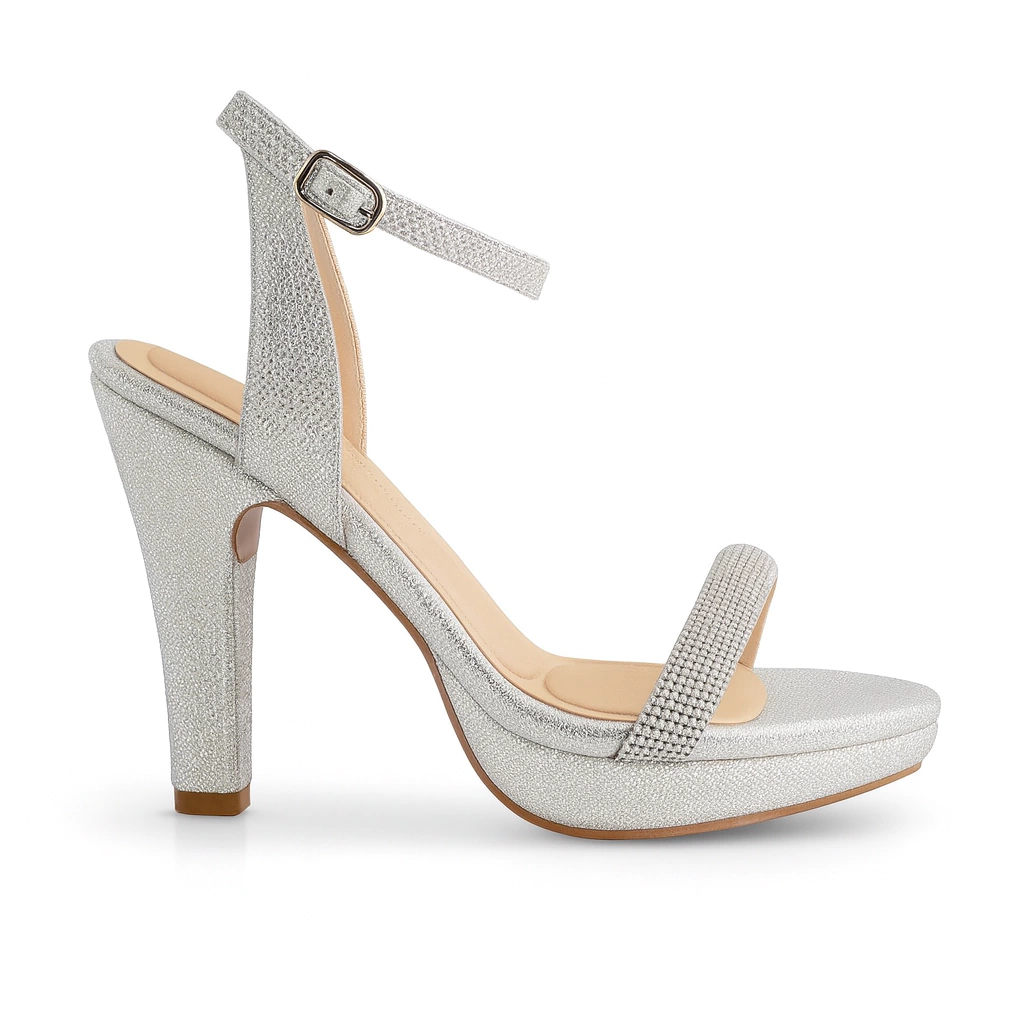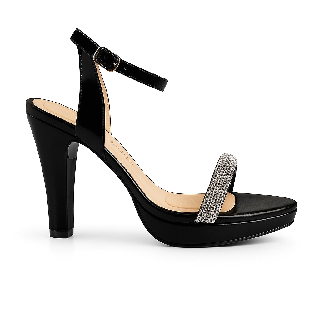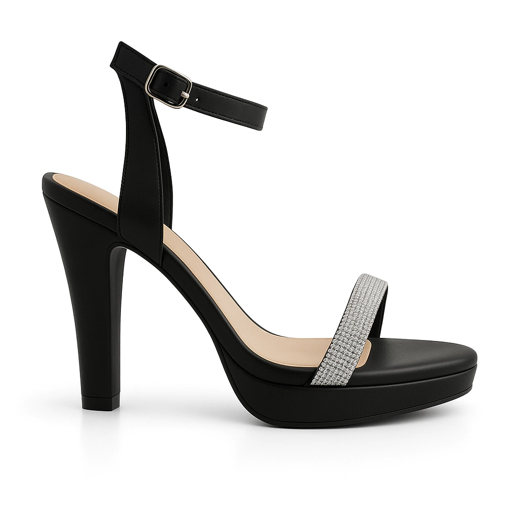 Zapato en punta redonda abierta, tira trasera que sujeta el pie, tira con strass en el empeine y taco de 8 cm