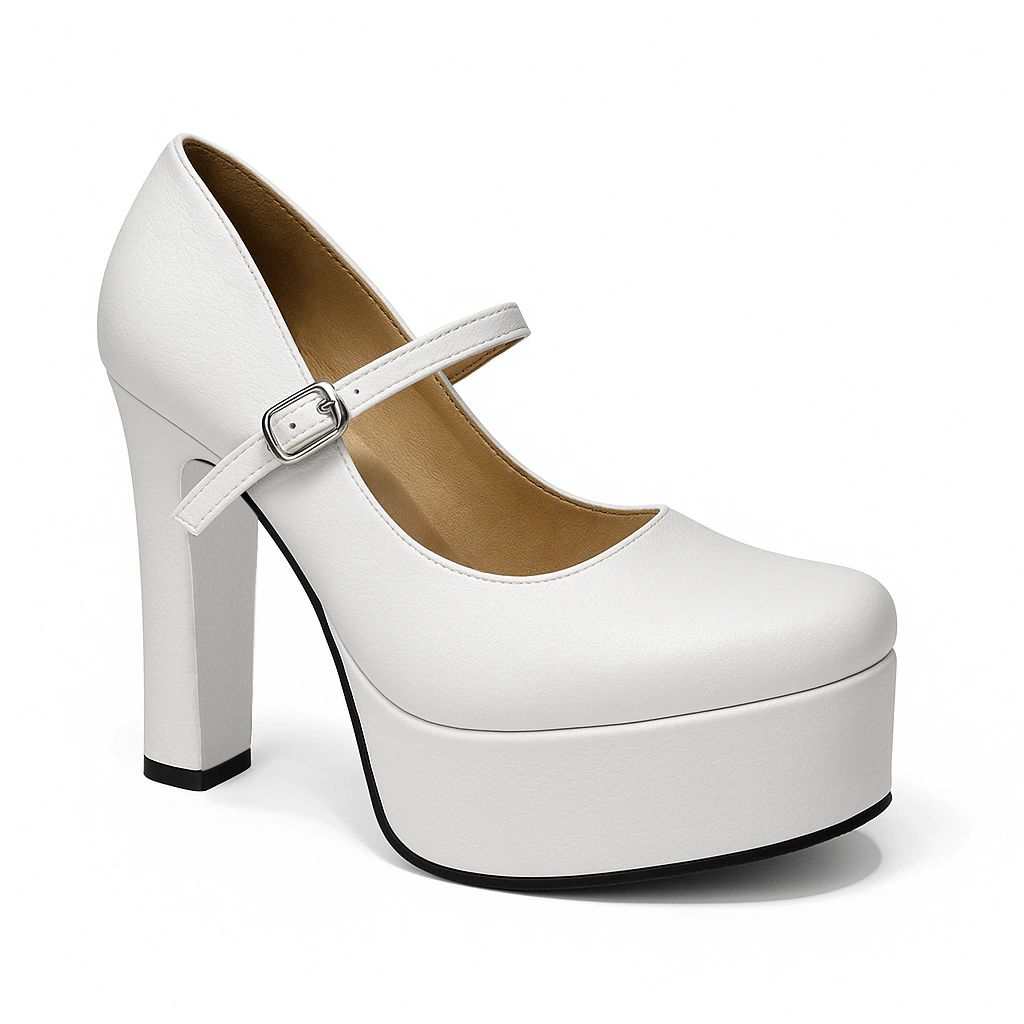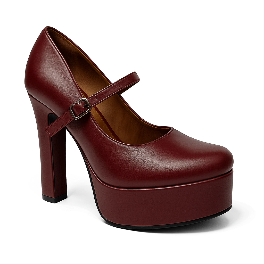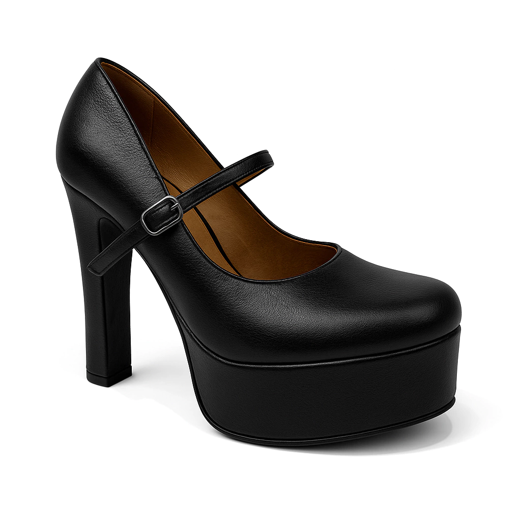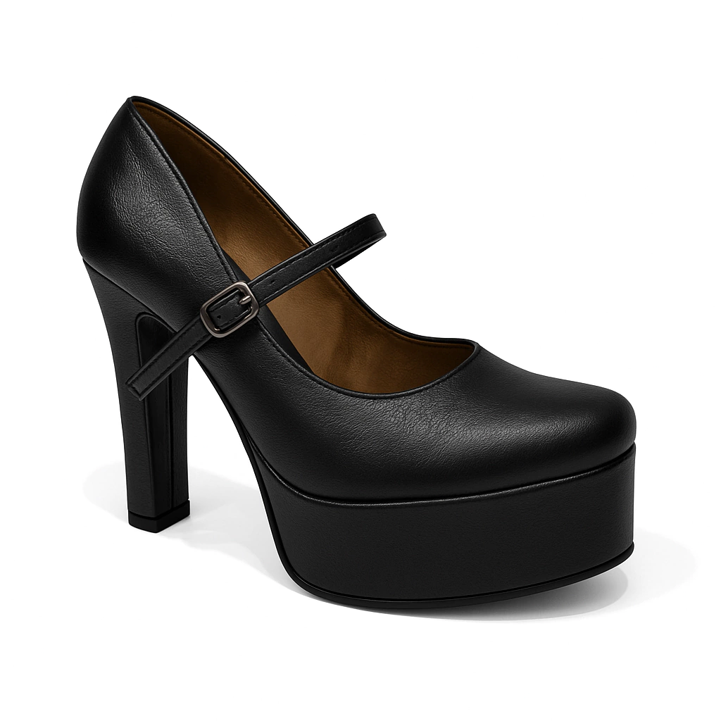 Zapato clásico liso con punta redonda, tira que sujeta el pie con hebilla, plataforma de 3,5 cm y taco lxv (luis 15) de 10,5cm