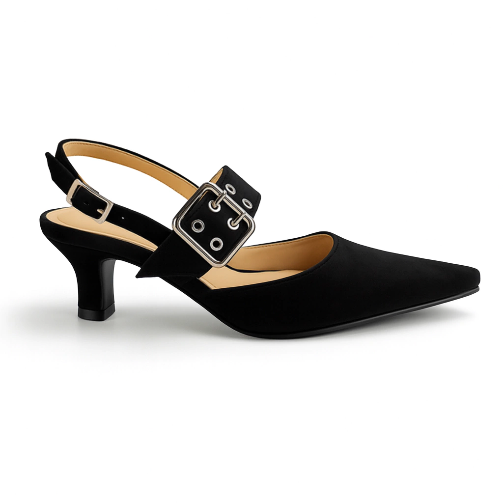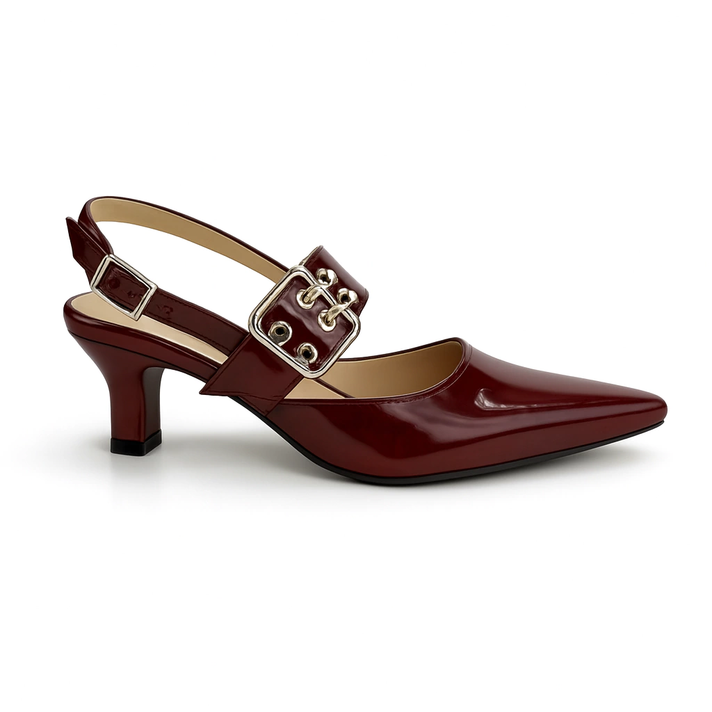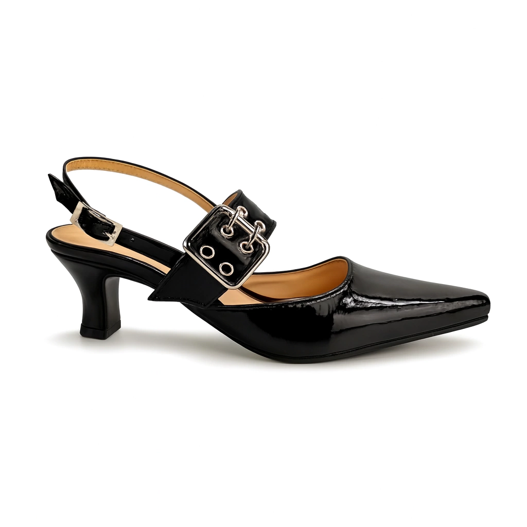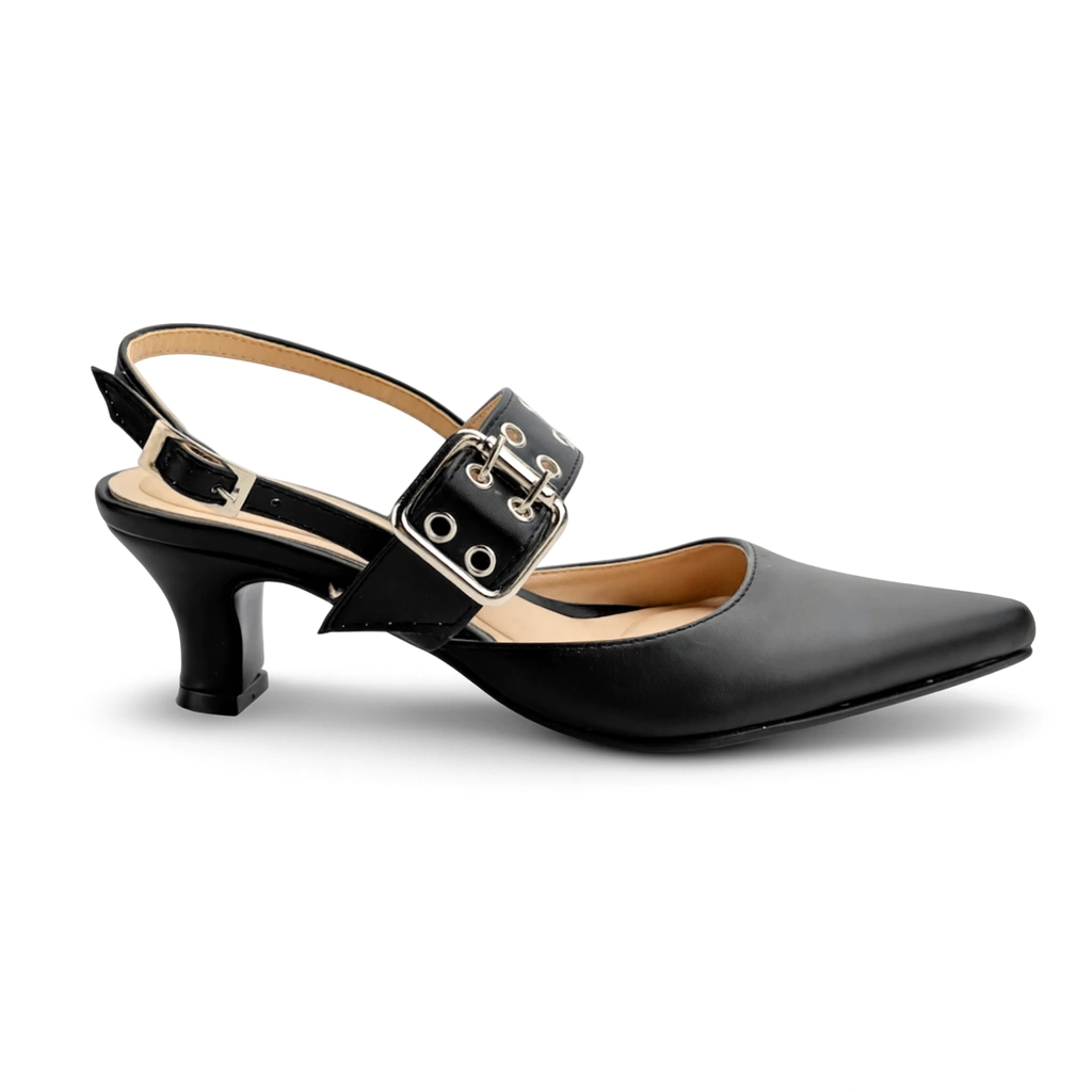 Zapato en punta cerrada, tira trasera que sujeta el pie, tira con tachas que rodea el pie y taco de 5,5 cm
