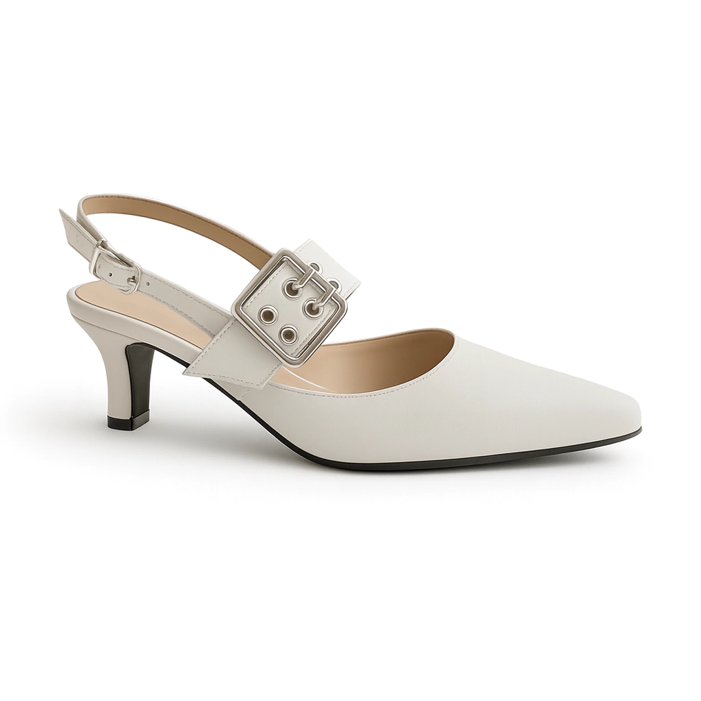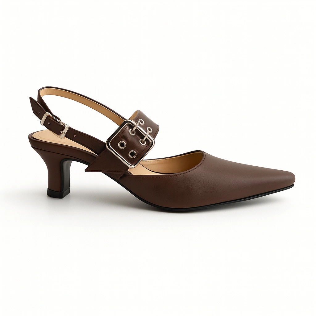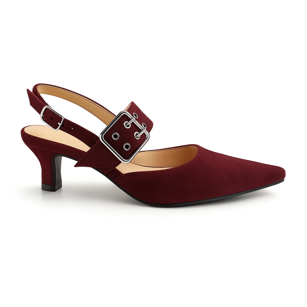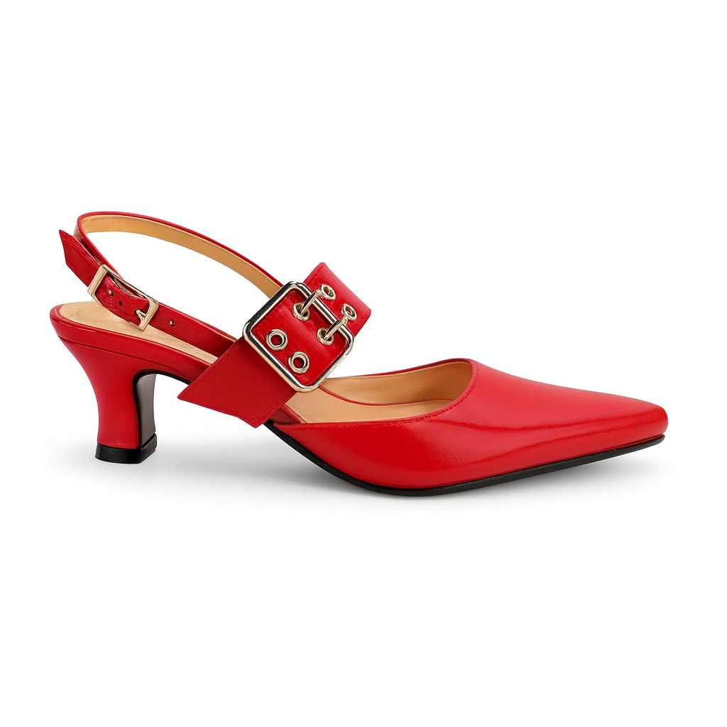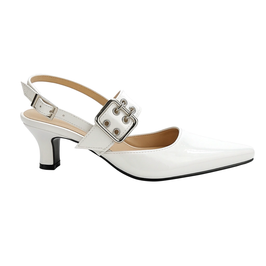 Zapato en punta cerrada, tira trasera que sujeta el pie, tira con tachas que rodea el pie y taco de 5,5 cm